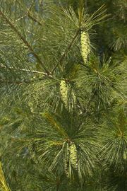 25-30 m magas, széles kúpkoronájú fenyő örvösen álló, vízszintes ágakkal. Egyenes törzsén a kéreg sokáig szürkészöld és sima marad. Egy csomóban ötösével álló, 5-10 cm-es puha tűi szürkészöldek. Karcsú, hengeres, kissé meggörbült tobozai 10-20 cm hosszúak. Száraz helyre ne ültessük!